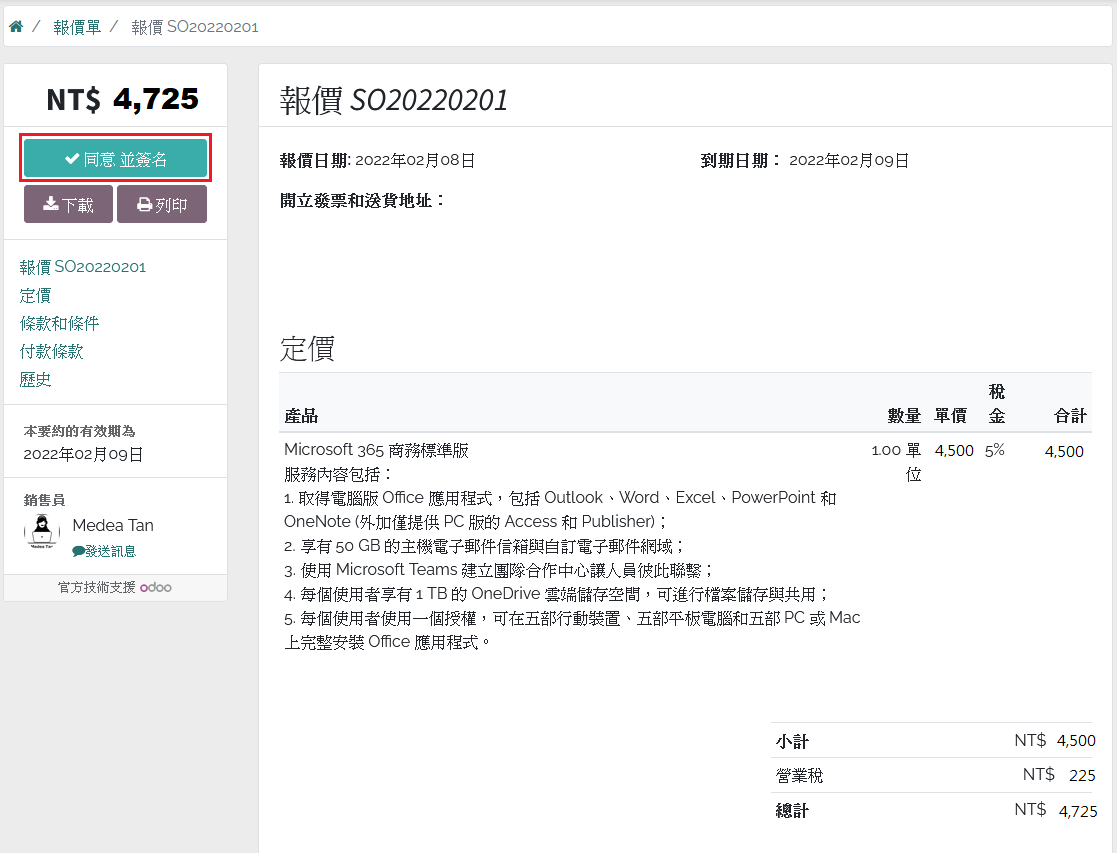 3. 您就可以看到這張報價單與相關細節,只要點「同意並簽名」就可以了。